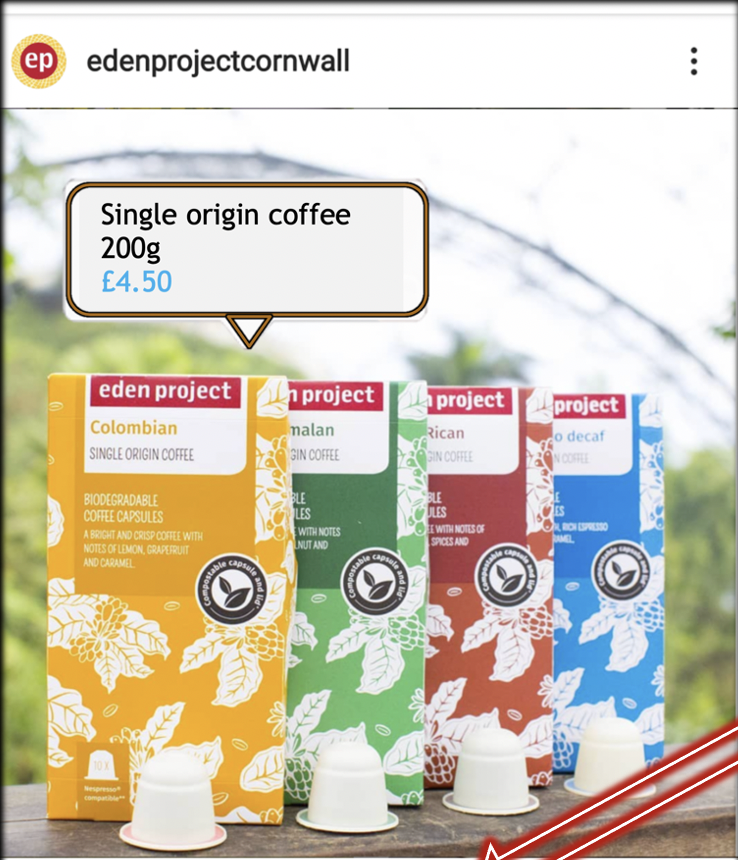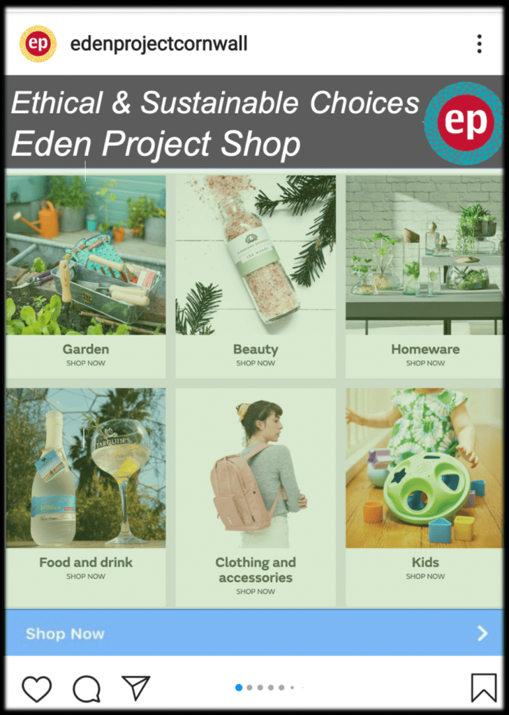 Another source of income for the Eden Project is their shop. In comparison to their main business social media channels, their shop’s social media channel following was severely behind (around 70k vs 4k followers on Instagram, with their main Facebook page having around 160k followers at the time), suggesting that the majority of people who used their shop would have done so during a visit to the attraction.