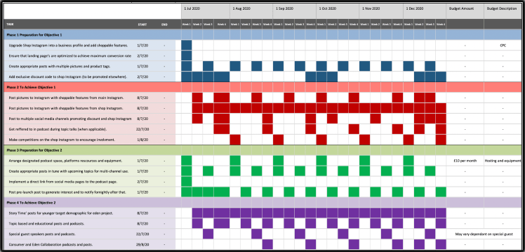 Finally, I created a detailed posting schedule to guide when and how frequently to post, and how long to post for, along with measurement and evaluation methods, both of which are really important and useful for any marketing plan.